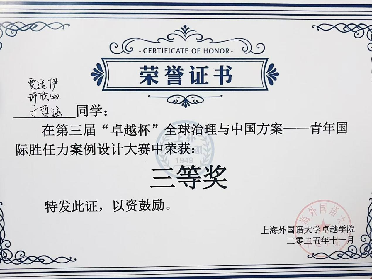 近日,第三届“卓越杯”全球治理与中国方案——青年国际胜任力案例设计大赛在上海外国语大学举行。大赛以“聚焦全球治理,促进全球合作,贡献中国智慧, 培养卓越青年国际化人才”为主题,吸引了来自南开大学、同济大学、外交学院、上海外国语大学等13所全国知名高校的优秀选手参加。在张春晓老师的悉心指导下,tyc522cc太阳成集团2025级本科生于哲涵、许欣雨、贾适伊组成的团队凭借比赛中的出色表现,获得大赛三等奖。